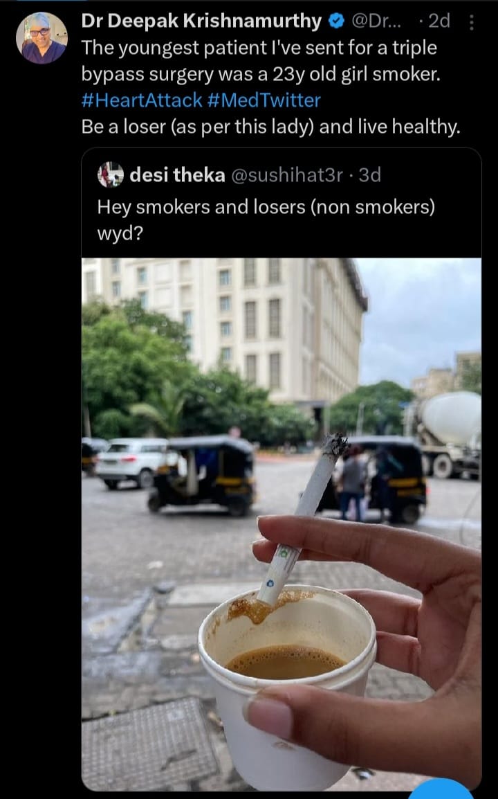 डॉक्टर ने री पोस्ट करते हुए कैप्शन में लिखा हैं कि, “सबसे कम उम्र की मरीज जिसे मैंने ट्रिपल बाईपास सर्जरी के लिए भेजा था। वह 23 साल की स्मोकिंग करने वाली लड़की थी। लूजर बनें ( जैसा की ये महिला कह रही हैं) और स्वस्थ रहें।” डॉक्टर ने बताया कि, मरीज 10- 12 साल की उम्र से ही स्मोकिंग कर रही थी। जिसके बाद 23 साल के उम्र तक उसकी हालत गंभीर हो गई।