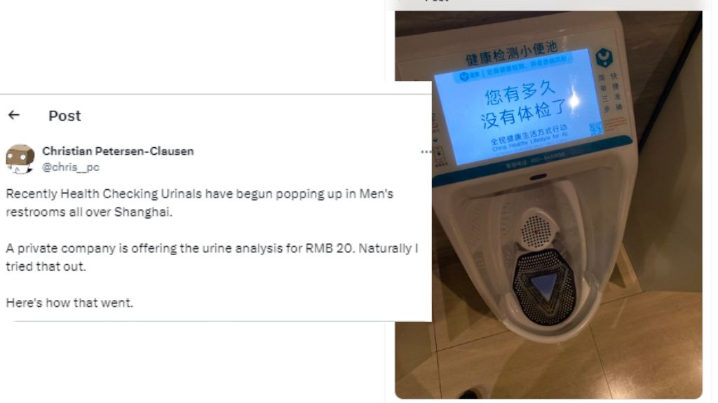 बता दें शंघाई स्थित डॉक्यूमेंट्री निर्देशक क्रिश्चियन पीटरसन-क्लॉसेन ने ऐसे यूरीनल सेंटर की फोटो ट्विटर थ्रेड पर शेयर की है और अपने इस एक्सपीरियंस के बारे में बताया है। वहीँ हाल ही में पूरे शंघाई में पुरुषों के टॉयलेट में हेल्थ चेकिंग यूरिनल दिखने लग गये हैं। वहीँ तस्वीर में हाई-टेक मशीन साफ़ दिखाई दे रही है। इस तरह से पेशाब की जाँच कराने के लिए लोगों को कहीं जाने की जरूरत नहीं हैं। इन पब्लिक टॉयलेट्स में ही बड़ी ही आसानी से जांच हो पायेगी और ऑनलाइन ही रिपोर्ट भी मिल जाएगी।