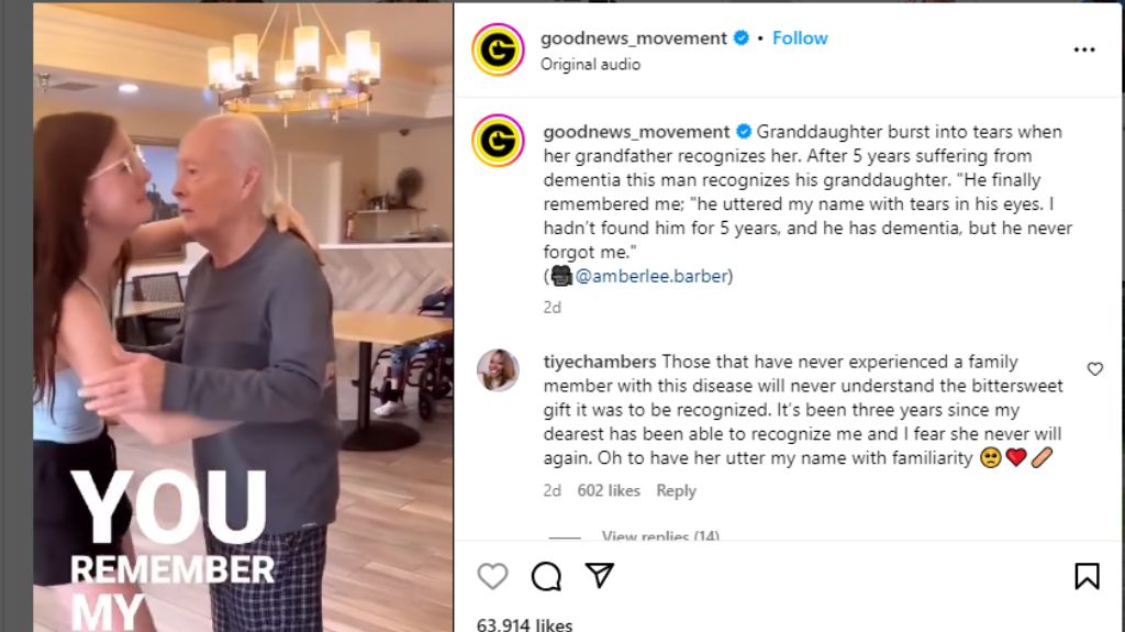 बता दें इंस्टाग्राम अकाउंट @goodnews_movement पर अक्सर सकारात्मक वीडियोज पोस्ट होते हैं। हाल ही में एक वीडियो पोस्ट किया गया है, जिसमें एक पोती और उसके दादा के बीच प्यार नजर आ रहा है। इस वायरल वीडियो में बताया गया कि बुजुर्ग शख्स को भी डिमेंशिया है और 5 सालों से वो सब कुछ भूले हुए हैं। उन्हें किसी का नाम भी याद नहीं था अचानक एक दिन उन्हें उनकी पोती याद आ गई। ये सुनकर पोती इतनी ज्यादा खुश हो गई कि वो रोने लगी और उसने अपने दादा को गले लगा लिया।