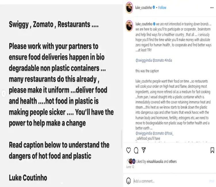 दरअसल हाल ही में एक महिला ने सोशल मीडिया पर एक पोस्ट शेयर कर जोमैटो को सलाह दी है कि प्लास्टिक के कंटेनर्स में खाना देना बंद करें। क्योंकि इसमें गर्म खाना पैक करने से लोग बीमार पड़ सकते हैं। बता दें कि महिला का नाम ल्यूक कॉटिन्हो है जोकि एक न्यूट्रिशनिस्ट है। पोस्ट में न्यूट्रिशनिस्ट ल्यूक कॉटिन्हो ने लिखा कि कई रेस्टोरेंट नॉन-प्लास्टिक कंटेनर का उपयोग कर रहे हैं क्योंकि वो जानते हैं कि प्लास्टिक में पड़ा गर्म खाना लोगों को बीमार कर सकता है। ऐसे में आपको भी नॉन-प्लास्टिक कंटेनर का यूज करना चाहिए।