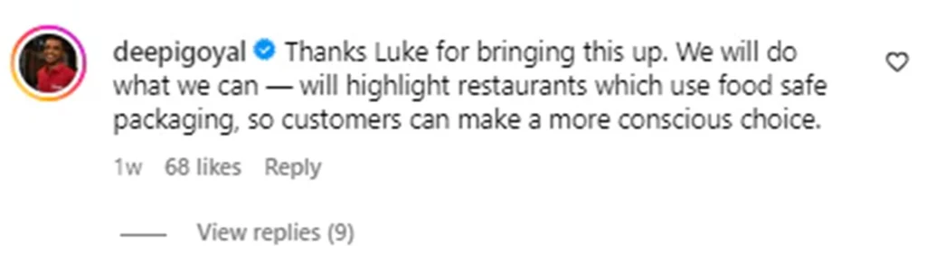वहीं महिला के पोस्ट पर कंपनी के CEO दीपिंदर गोयल ने रिप्लाई किया की कि आपका शुक्रिया की आप इस मामले को हमारे सामने लाई। हम पूरी कोशिश करेंगे कि हमारे रेस्टरोंट में जो खाद्य सुरक्षित पैकेजिंग होगी वो बायोडिग्रेडेबल नॉन-प्लास्टिक कंटेनरों में ही हो ताकि लोग अधिक सचेत और हेल्दी खाने का विकल्प चुन सकें।
