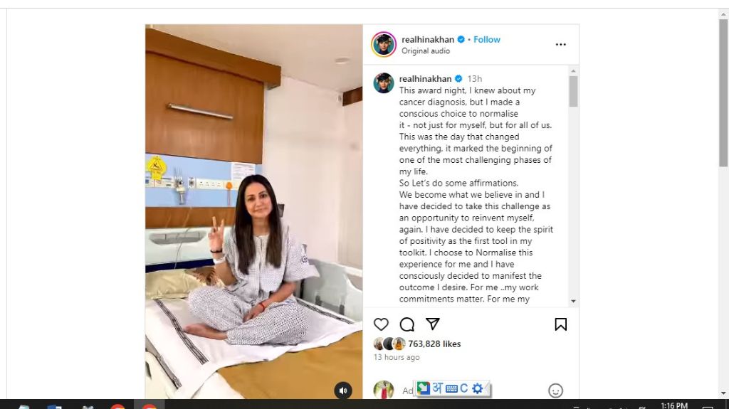 अपनी इंस्टाग्राम पोस्ट में कुछ दिन पहले हुए एक अवॉर्ड फंक्शन की वीडियो शेयर करते हुए हिना खान ने लिखा कि मैं एक अवार्ड शो में जा रही थी और उस दिन मुझे कैंसर के बारे में पता चला। लेकिन मैंने अपने खुद के लिए और पूरी दुनिया के लिए कैंसर जैसी बीमारी को भी नार्मल बनाने का फैसला लिया है।