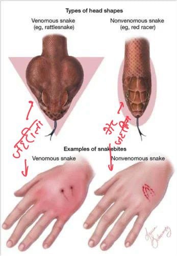 बता दें कि जो जहरीले सांप होते हैं उनके शीर्ष बहुत बड़े यानी त्रिकोण आकार के होते हैं जबकि गैर जहरीले सांप का शीर्ष सामान्य होता हैI वहीं आमतौर पर 2 दांत के निशान जहरीले सांप के होते हैं और छोटे-छोटे बहुत सारे निशान गैर जहरीले सांप के होते हैं।
