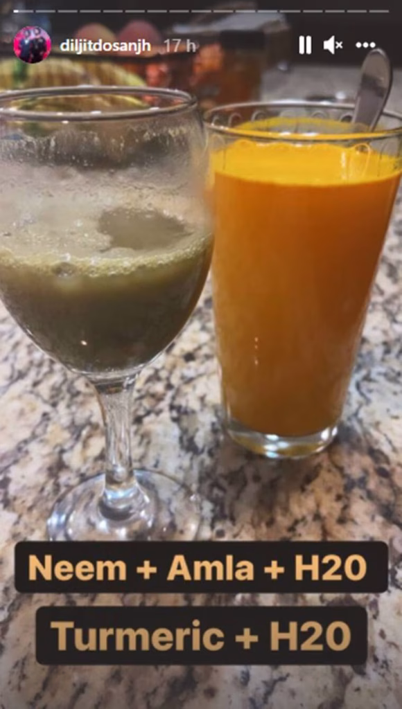 इसके अलावा दिलजीत नीम और आंवला से बनी ड्रिंक भी पीते हैं। यहां नीम हार्ट को हेल्दी रखता है और आई साइट बढ़ाता है वहीं इससे लिवर और इम्यून सिस्टम ठीक रहता है। इसके अलावा आंवला में विटामिन-ए, पाइरिडोक्सिन, राइबोफ्लेविन जैसे पोषक तत्व और सोडियम, पौटेशियम, कैरोटीन, कैल्शियम, तांबा, फास्फोरस, मैंग्नीज, मैग्नीशियम और आयरन जैसे मिनरल्स पाए जाते हैं जो पाचन शक्ति को बढ़ाने में मदद करेंगे।