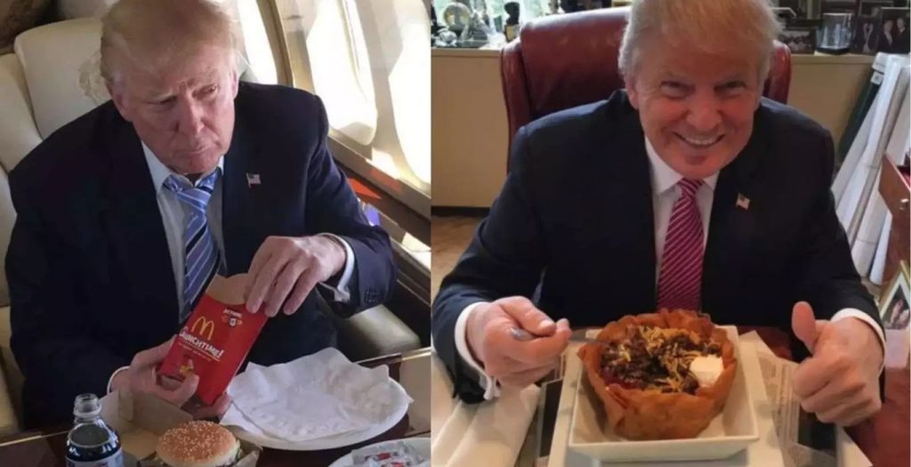 कोरी लिवांडोव्स्की द्वारा सह-लिखित एक पुस्तक के अनुसार ट्रम्प का सामान्य डिनर दो बिग मैक्स, दो फिलेट-ओ-फिश और एक चॉकलेट माल्टेड मिल्कशेक होता है । उनका फास्ट फूड के प्रति प्रेम इस कारण है कि उन्हें लगता है कि इस प्रकार के भोजन में बदलाव का कम मौका होता है। ट्रम्प का यह भी मानना है कि मैकडॉनल्ड्स में वह अपने भोजन को सुरक्षित महसूस करते हैं क्योंकि वहां भोजन पहले से तैयार रहता है और कोई भी उन्हें देख नहीं सकता है।